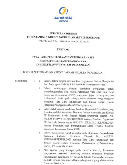 Standard Operating Procedure tentang Pedoman Tata Kelola Jamkrida Jakarta